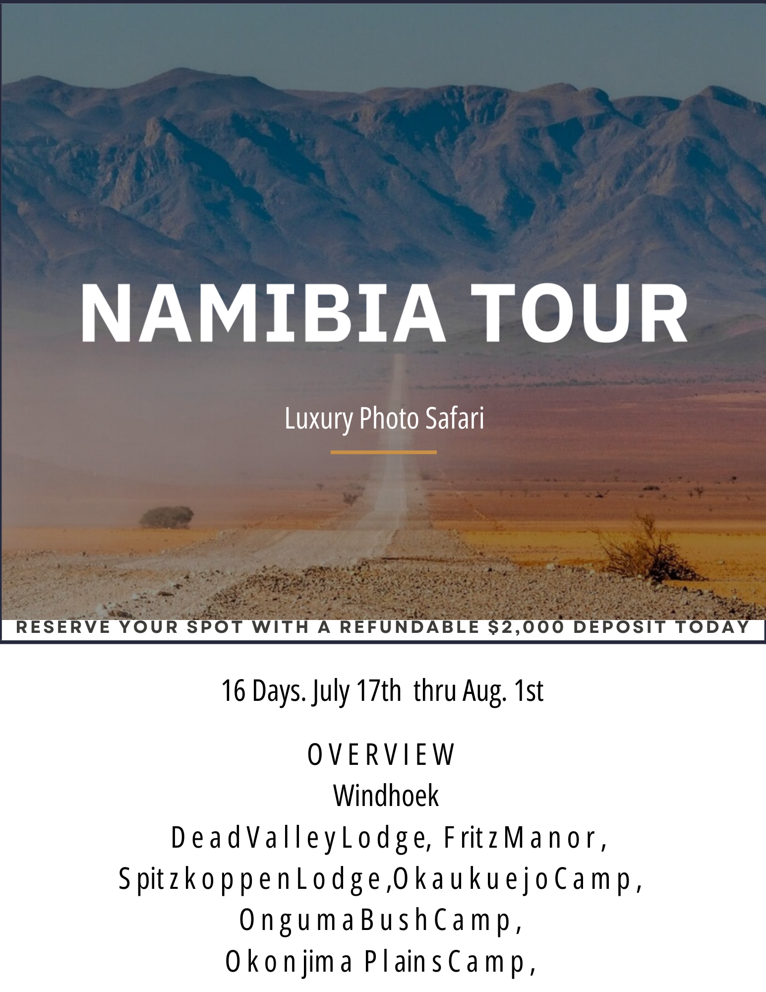 $21,500.00Embark on a captivating journey through the mesmerizing landscapes of Namibia with our exclusive photography workshop. Nestled amidst the surreal dunes of the Namib Desert and framed by the ethereal beauty of Deadvlei, this workshop offers a once-in-a-lifetime opportunity to capture the essence of this extraordinary land. From the iconic red dunes of Sossusvlei to the rugged landscapes of Damaraland, each location serves as a canvas for your creative vision. Immerse yourself in the rich culture and wildlife, as our workshop provides not only technical expertise but also a profound appreciation for the breathtaking scenery that defines Namibia. Join us for an immersive photography experience that transcends the ordinary, capturing the soul of Namibia through your lens.
